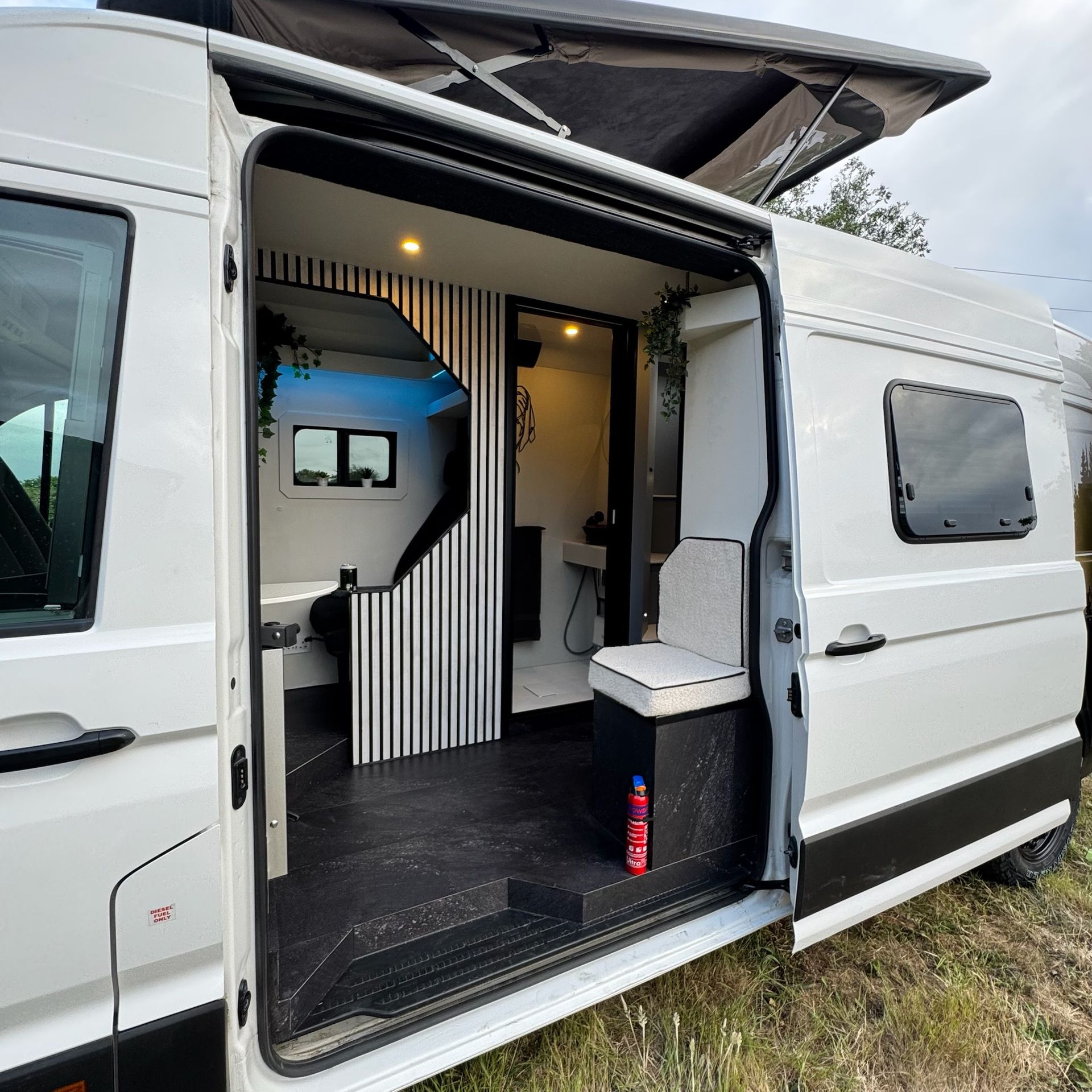 Key features: Modern Midnight Family of 4 Design, Simple Layout, Small Parking Friendly Van, Swivel Cab Seats, Step Wall Leading to Pop Top.