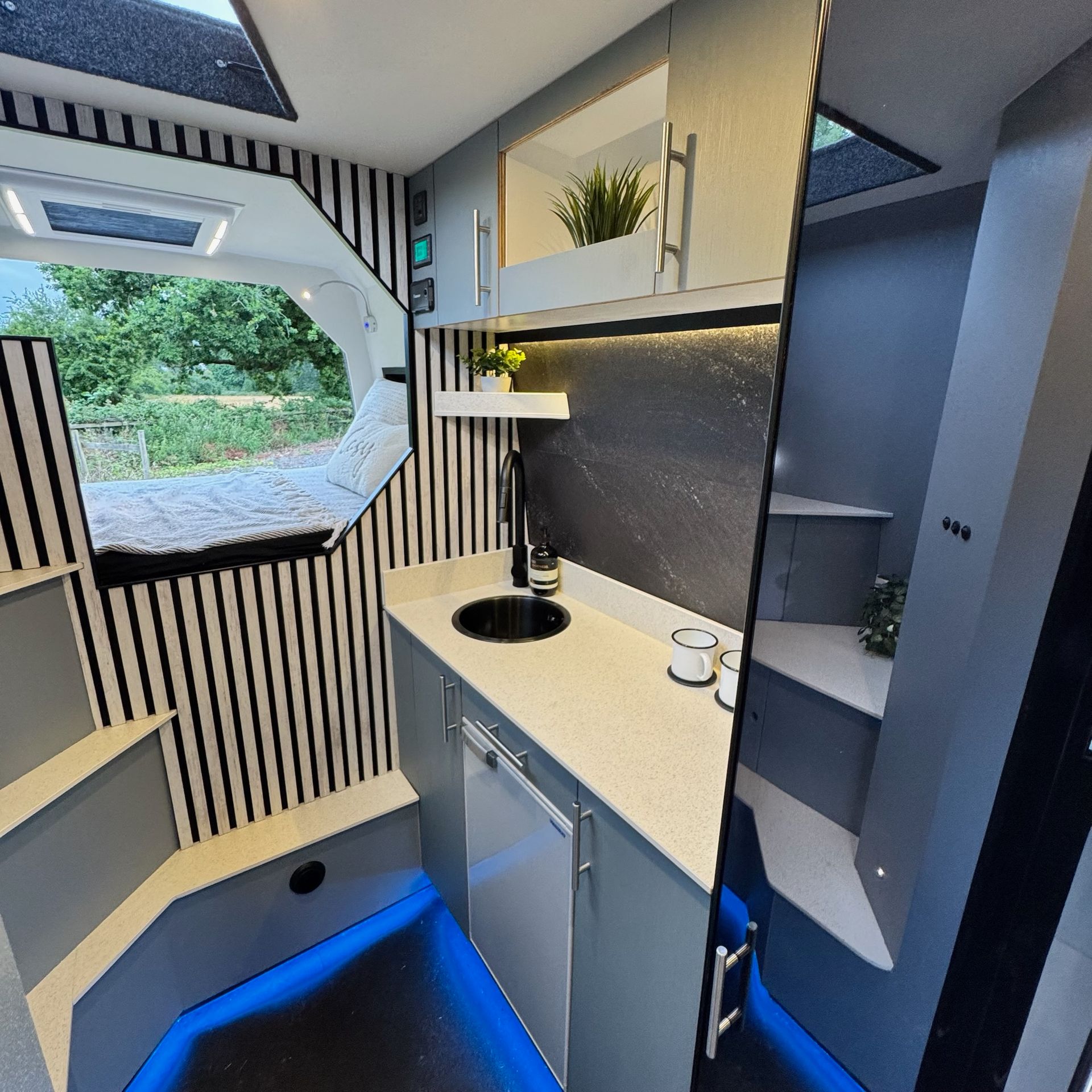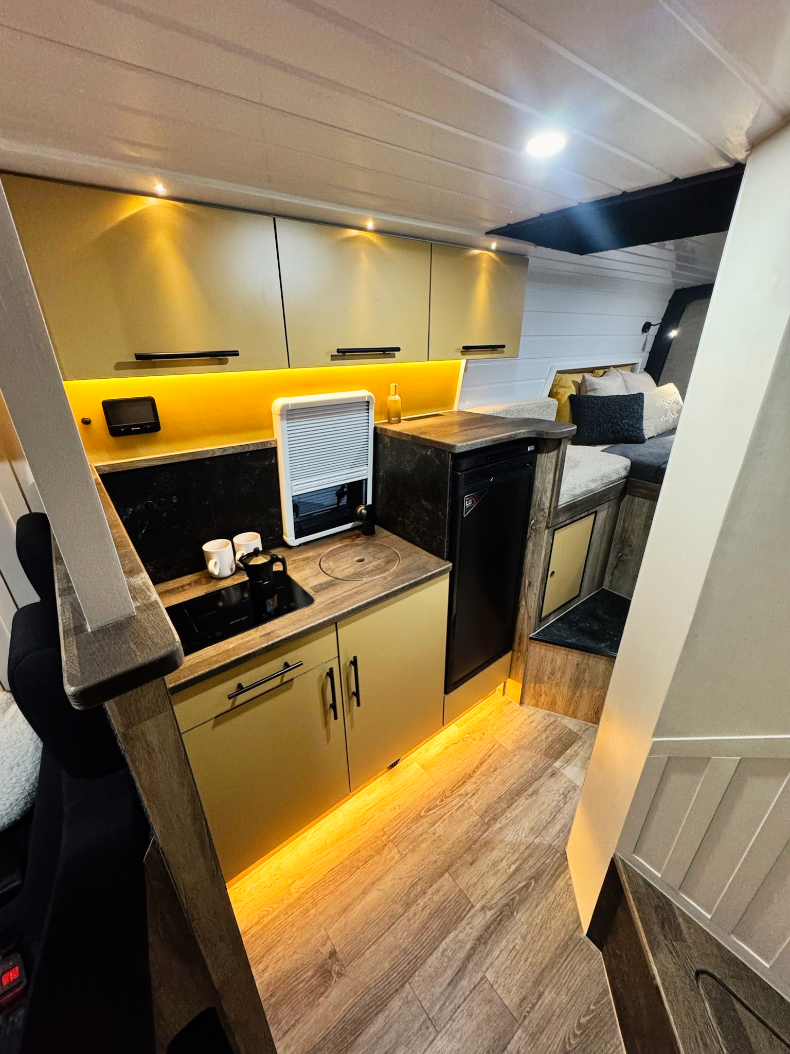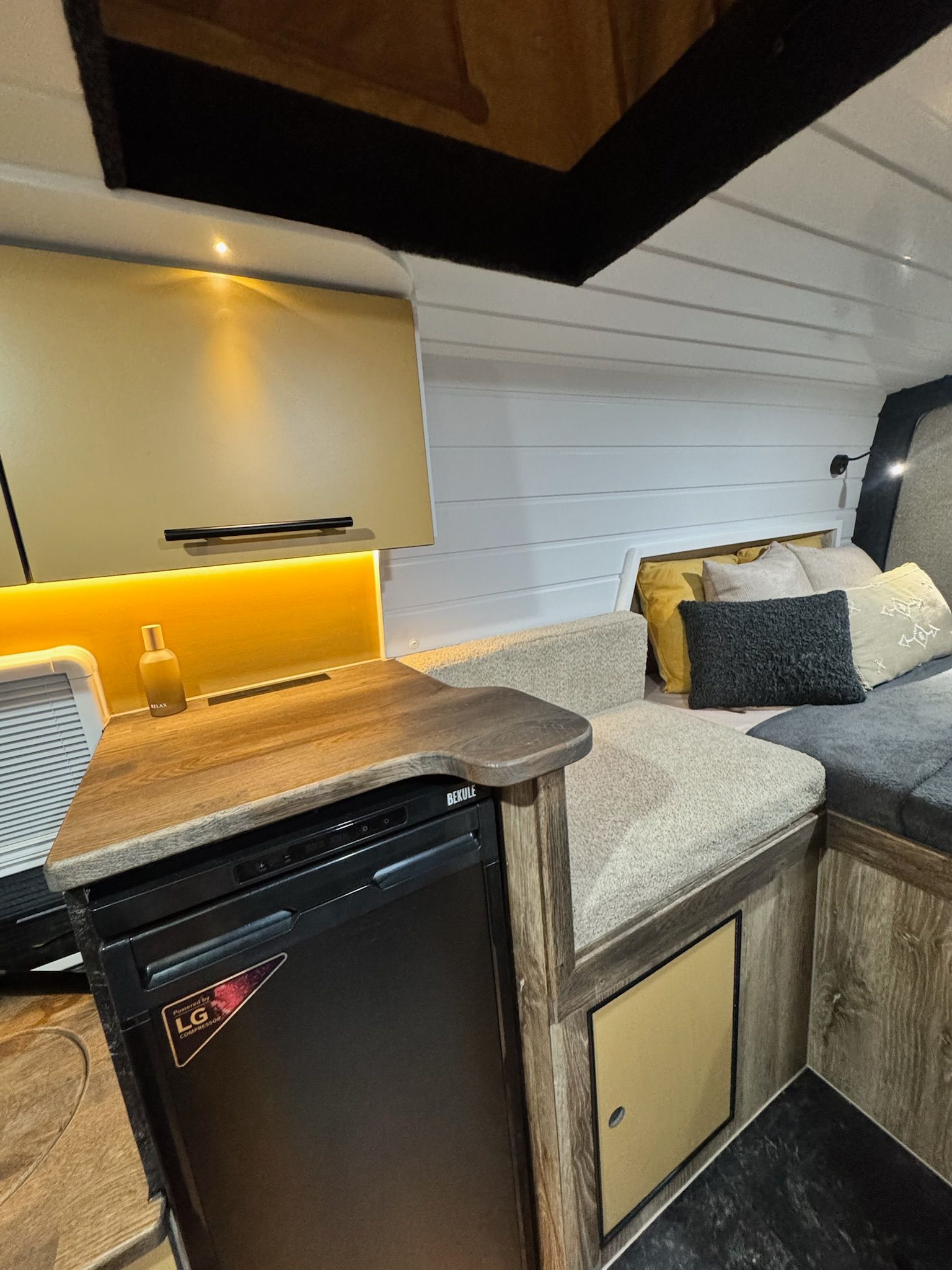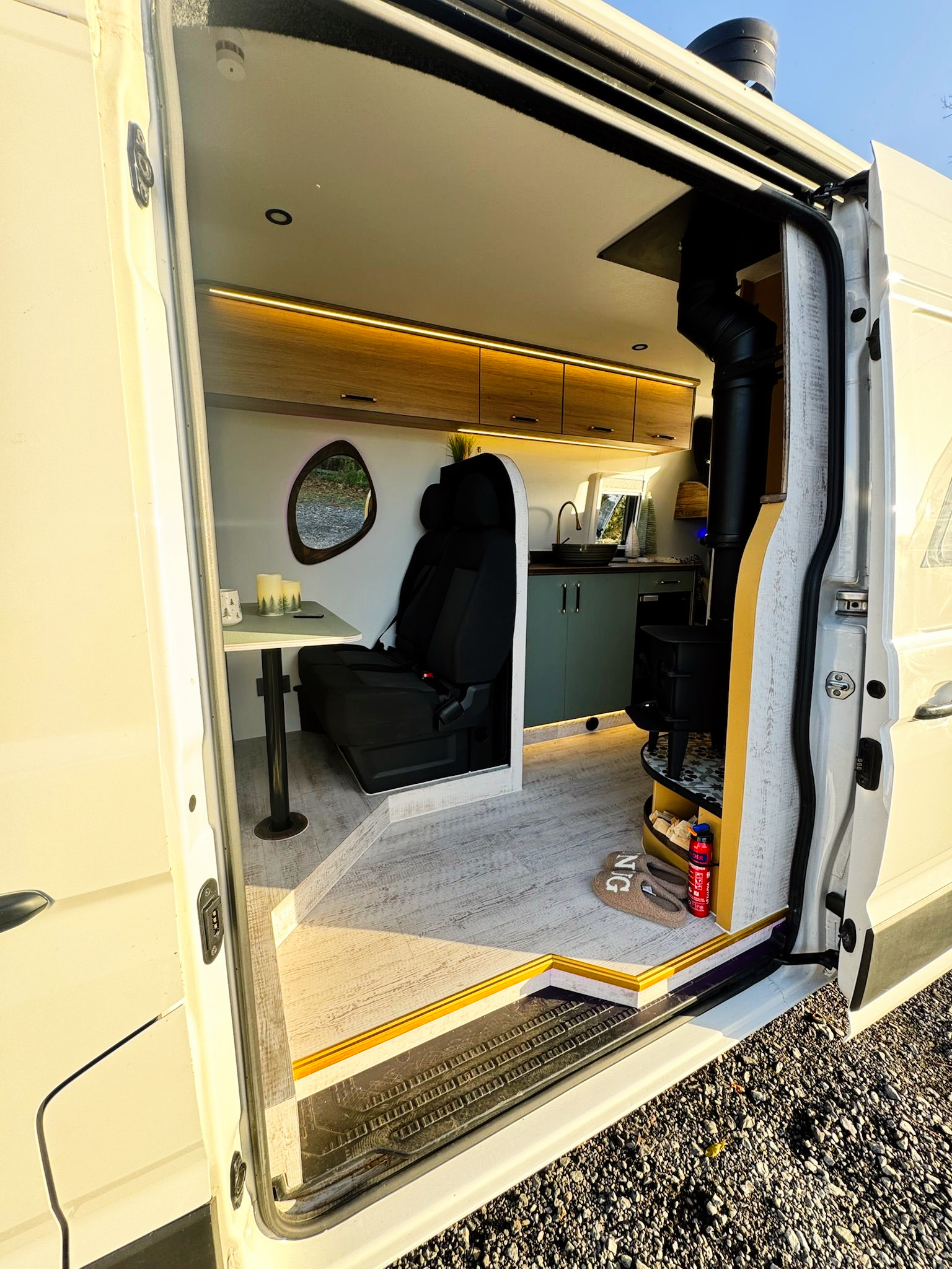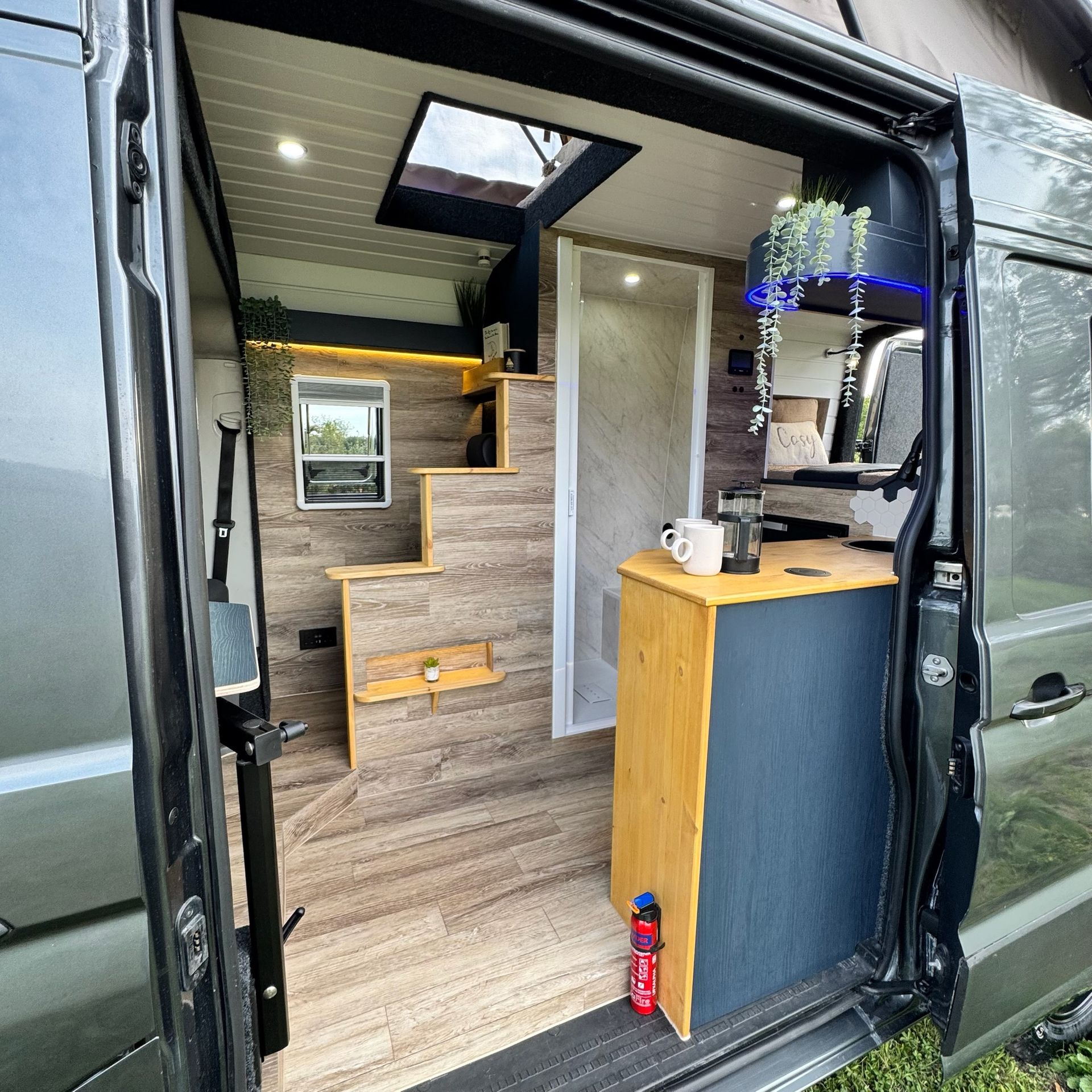 Key features: 3 Berth, Parking Friendly Small Van, Live Edge Redwood Counter Tops, Wet Room, L Shape Tiny Kitchen, Pull Out Multi Use Bed / Seat / Storage.