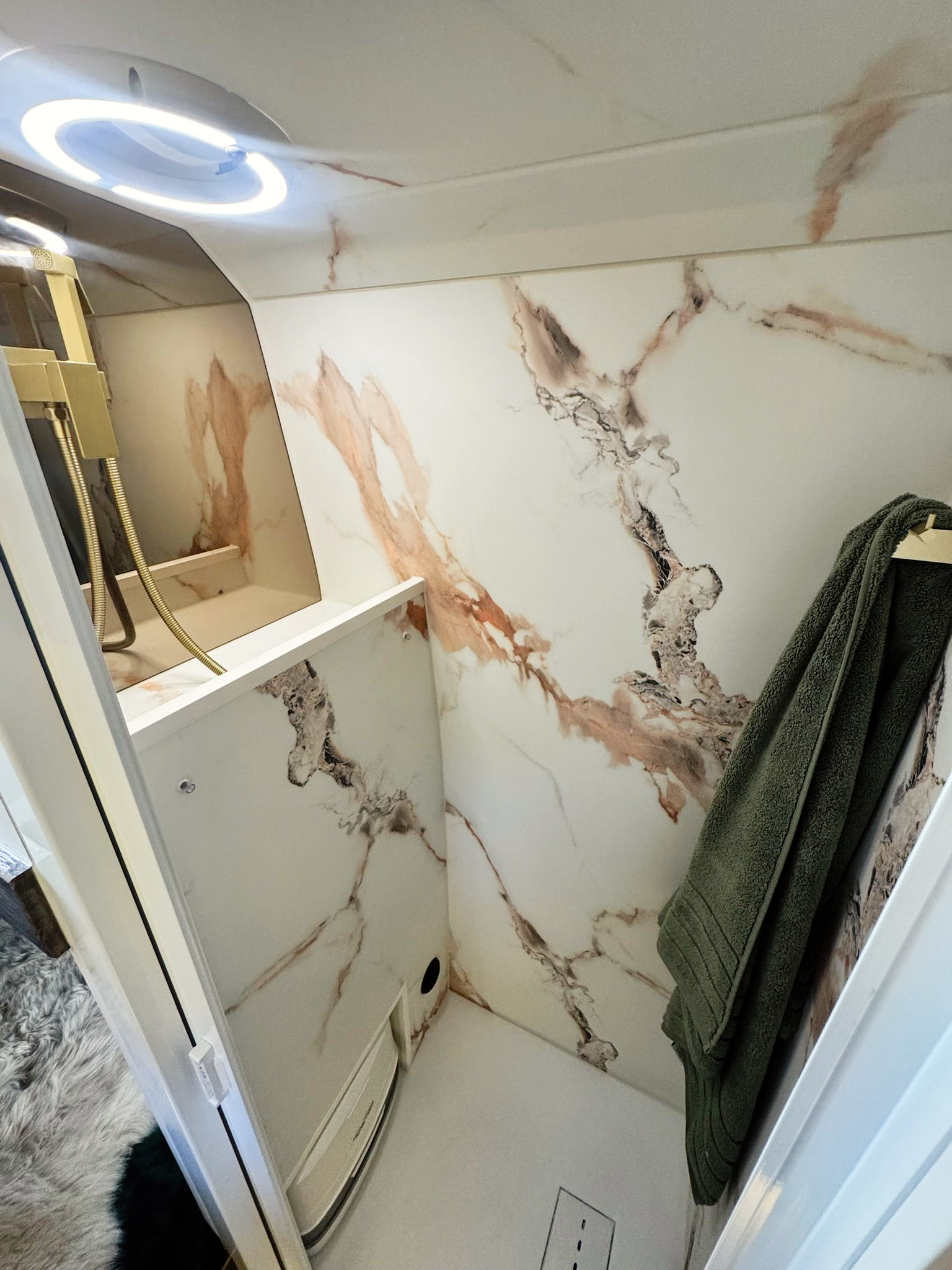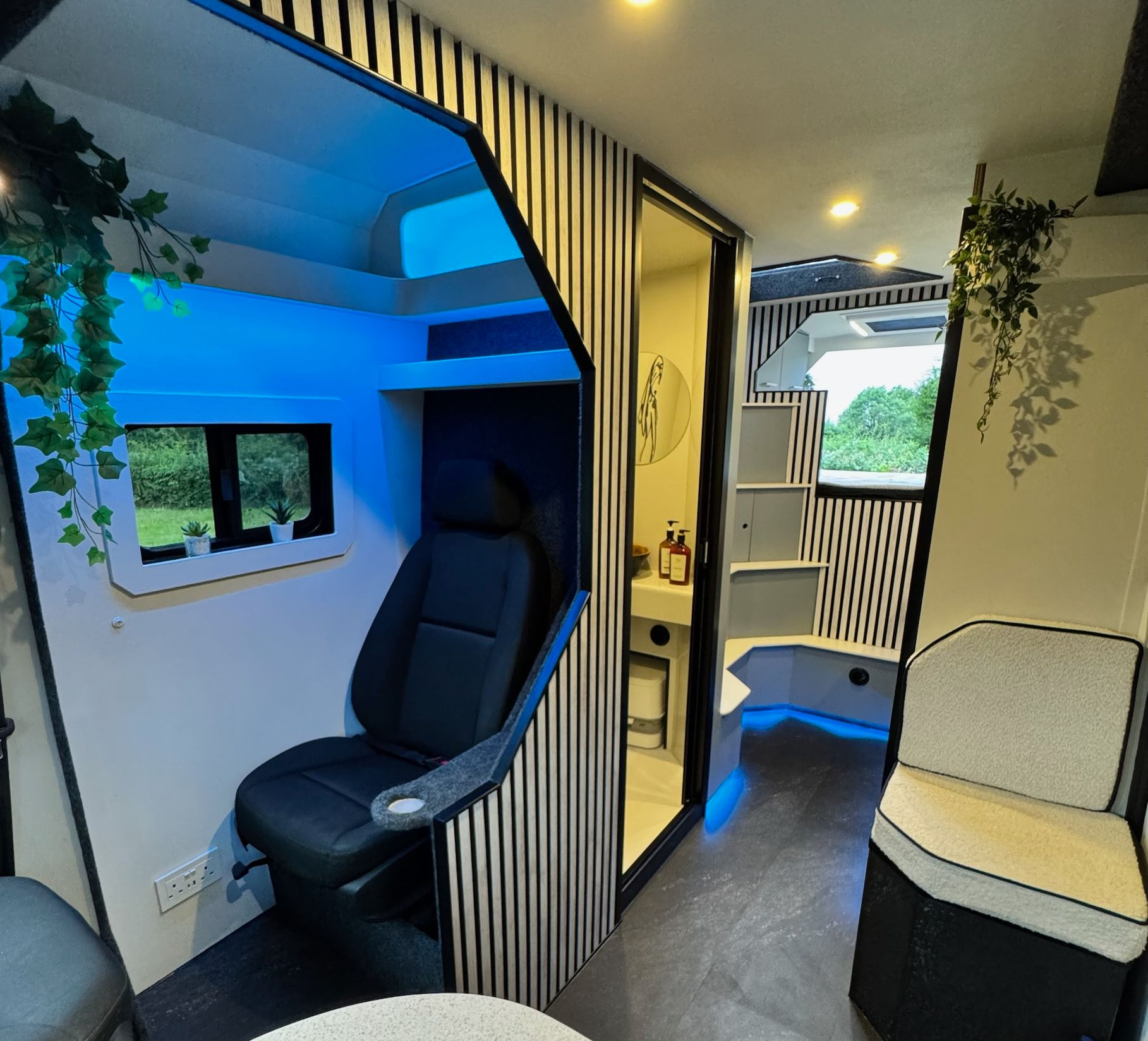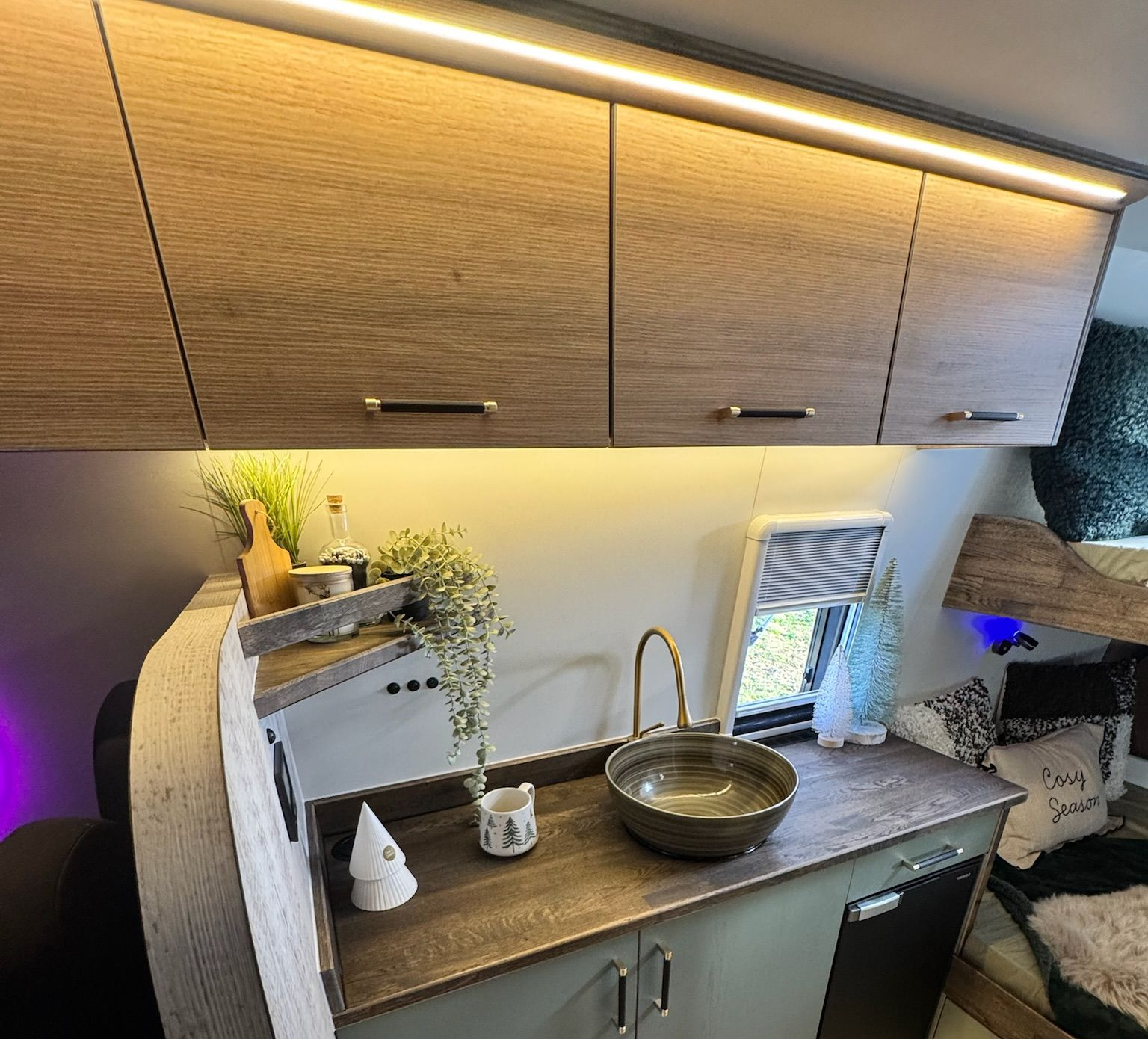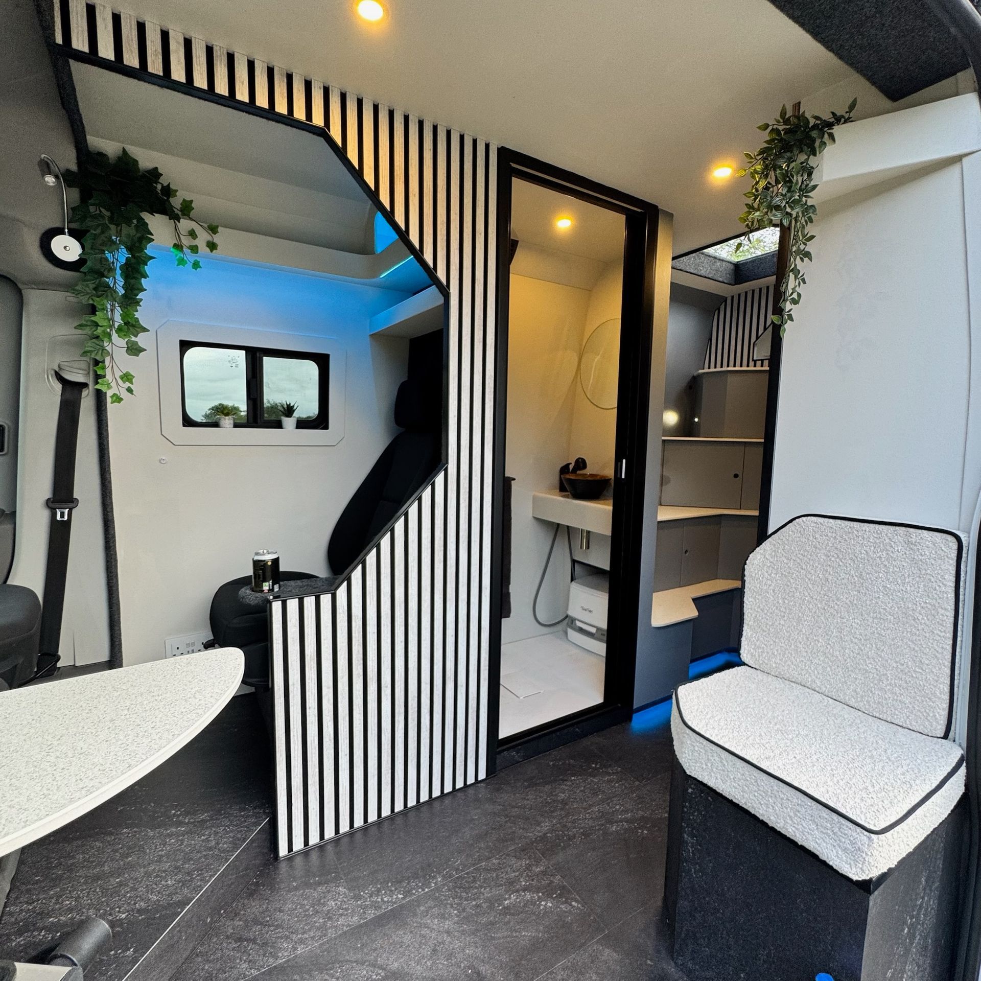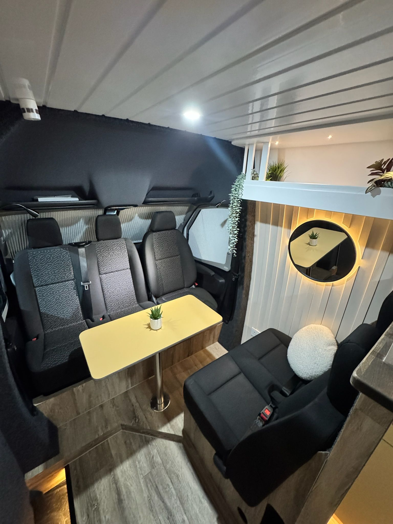 Key features: 3 Berth, Parking Friendly Small Van, Live Edge Redwood Counter Tops, Wet Room, L Shape Tiny Kitchen, Pull Out Multi Use Bed / Seat / Storage.