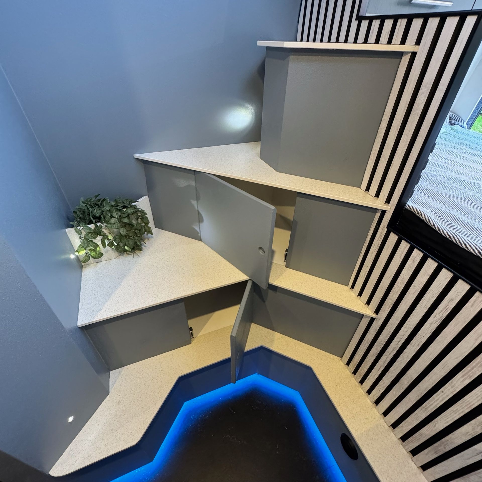 Key features: 3 Berth Surf Shack Design, Custom Artwork Sun Ray & Wave Shelves, Air Fryer Corner, Storage Staircase With Wardrobe Leading to Pop Top Roof & Bedroom.