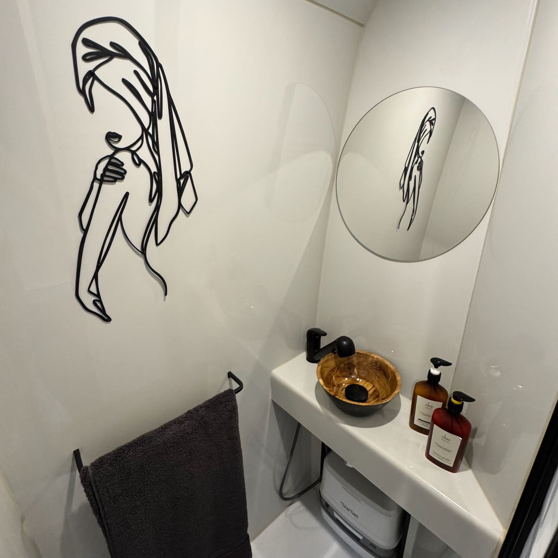 Key features: Family of 3 Design, Boucle L Shape Sofa Bed, Bespoke Coffee Corner, Hidden Large Wet Room, Feature Mural Wall.