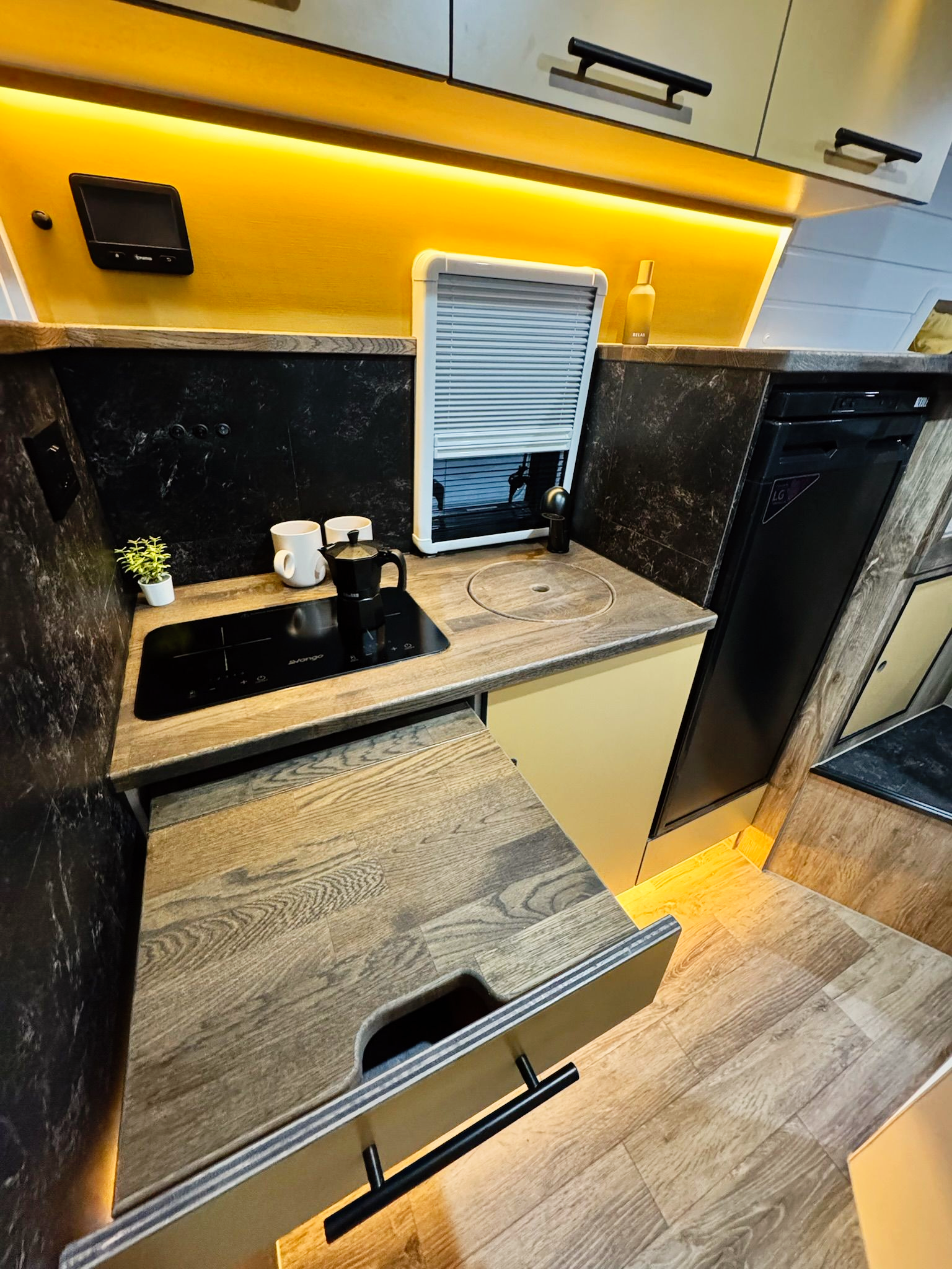 Key features: Practical Design For Full Time Van Life For 2, Space Saving Table, Bamboo Worktops, Lots of Storage.