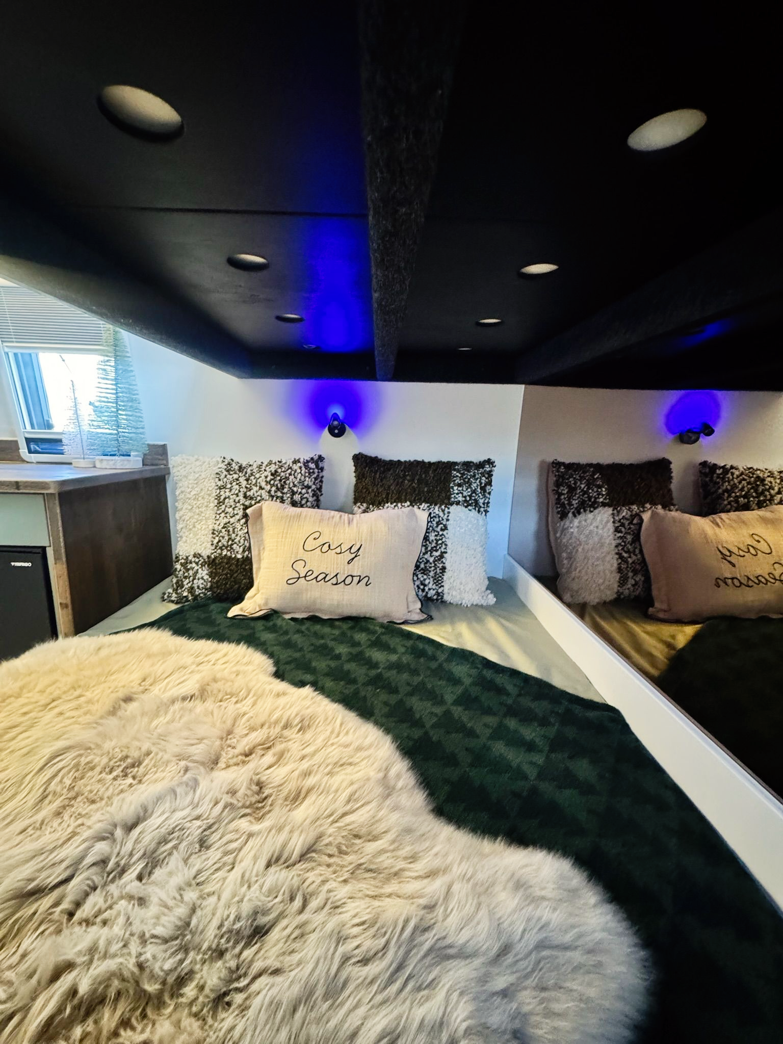 Key features: Beachy Family of 4 Design, L Shape Tiny Kitchen, Wood Burner, Surf Board Rack, Custom Hammock System.
